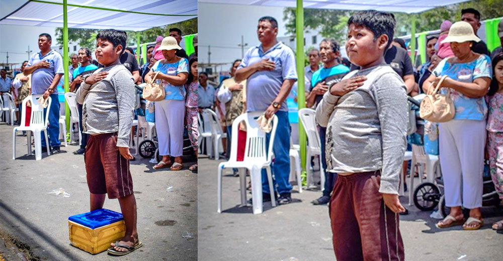 Su nombre es Jhair Snayder Huamán Soto, hoy 12 de febrero acaba de cumplir 10 años y ha sido catalogado como el “Niño Patriota” luego que hiciera una pausa en su trabajo de vender chupetes para cantar el himno nacional del Perú.