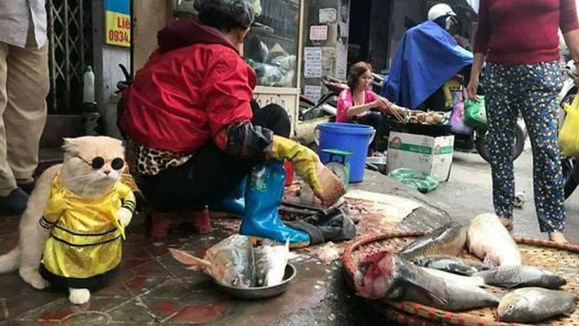 Le Quoc Phon es un vendedor ambulante de pescado que trabaja todos los días acompañado de su gato llamado ‘Dog’(perro en inglés). El adorable minino, de tan solo 3 años, capta la atención de todos los clientes pues ‘vende’ su mercadería vestido siempre con un atuendo de gala.